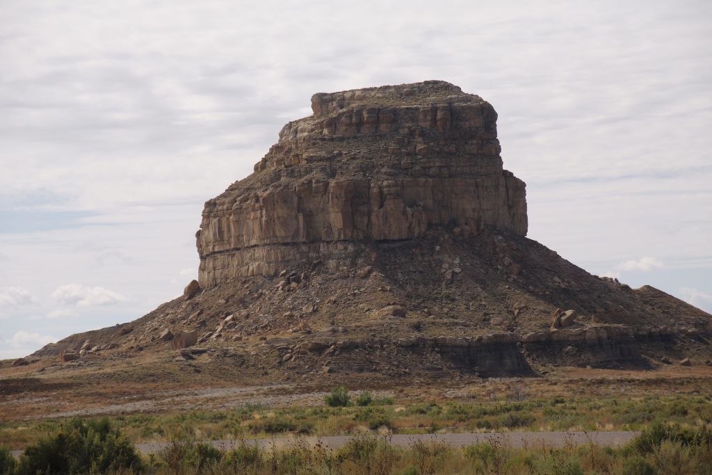 After breakfast, we checked out of the hotel, loaded on the bus and headed out north and west toward Chaco Canyon, and then on up to Farmington NM. Along the route Rich described the geological features and the flora and fauna. For example, in decreasing size there are plateaus, mesas, buttes, and pinnacles. We saw lots of sandstone, shale and volcanic rock. At numerous places along the highway, we passed 7000 foot elevation signs, and at one point we crossed the Continental Divide. The dominant trees along most of the route were junipers, with some cotton wood trees in the river bottoms and later there were ponderosa and some firs and spruce. Lots of gas and oil drilling, including fracking, although lower crude oil prices have had a significant economic impact.